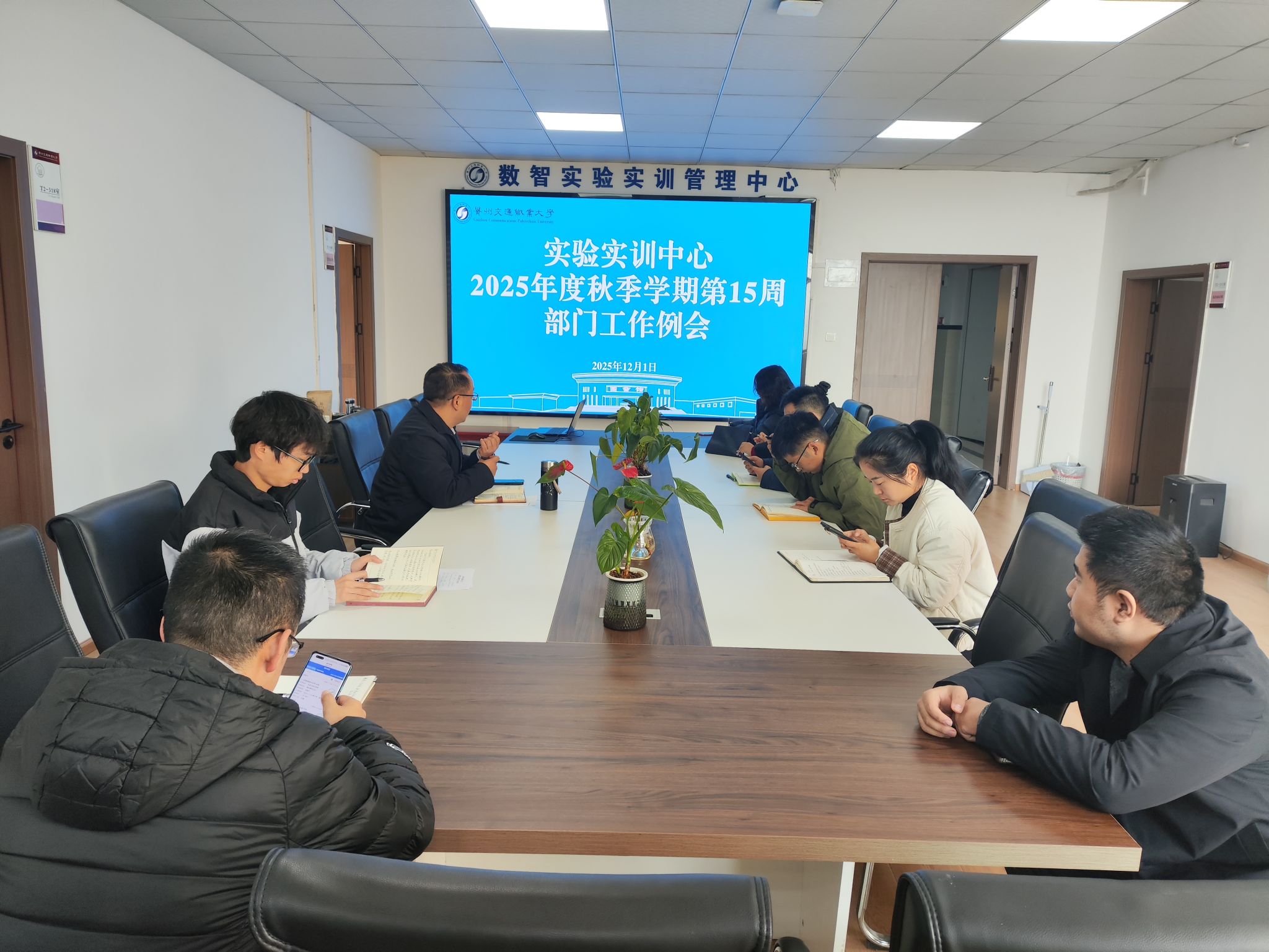 2025年12月1日,实验实训中心召开2025年度秋季学期第15周部门工作例会。会议由实验实训中心主任汪震主持,实验实训中心全体成员参加。本次会议围绕建设科、设备科、综合科近期重点工作进展、存在问题及完成节点展开深入交流,旨在进一步统一思想、明确目标、压实责任,确保年度各项任务如期高质量完成。